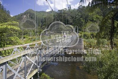 Woman crossing suspension bridge over Ohinemuri river at entranc
