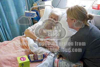 • Woman visiting elderly patient in hospital bed Cheltenham UK