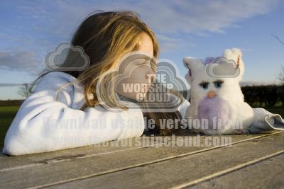 Young girl aged nine sitting on bench outside playng with Furby Cotswolds UK