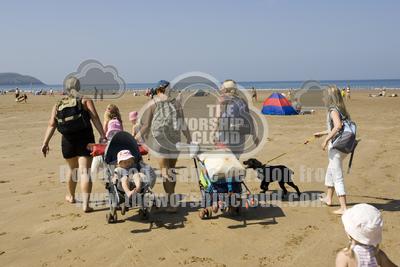 Young mothers with pushchairs and young children walking on beach in August, Woolacombe, Devon, UK