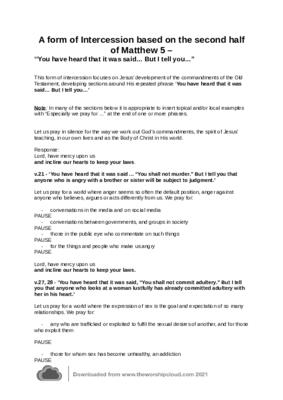 This form of intercession focuses on Jesus’ development of the commandments of the Old Testament, developing sections around His repeated phrase ‘You have heard that it was said… But I tell you…’