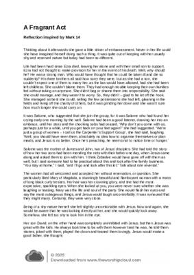 Clutching the bottle, she ran back into the village – the lights of Simon’s house and the chatter of voices somehow beckoning her on. She didn’t know what she was going to do, but she knew she had to do something. Looking back, the next few minutes were like a dream, one that she would remember in every detail for the rest of her life. Breathless with exertion, unable to speak, she burst in on the group and stood looking for Jesus. All noise ceased and for a moment no one moved. All eyes were upon her. In that moment, it seemed her world was shocked into stillness. Suddenly it was clear. This was her one chance to offer her love and support, to let him know that she understood.