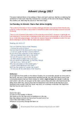 Each liturgy is on an A4 sheet and includes a brief outline of the reading, the Biblical reading ( NRSV) a short reflection and a prayer to close. To end the liturgy the refrain of we three kings maybe sung