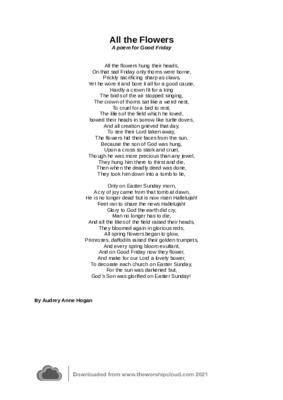 This is a poem for Good Friday and Easter Sunday. The sorrow of Good Friday and the Joy of Easter morning. An Allegorical poem which is based upon observations of nature in spring time. Jesus being King of creation, it seems right that nature itself should join in the sorrow of Good Friday and the joy of Easter Sunday. Written by Audrey Hogan