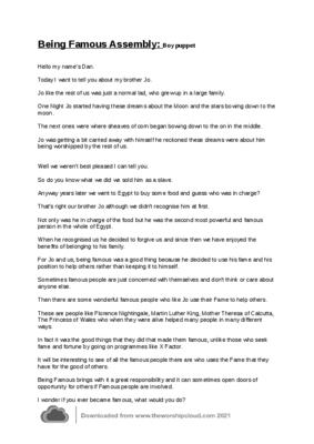 A Key stage 1 and KS2 assembly puppet sketch based on Joseph and what he did with his fame. How people in the past have done good things with their fame to help others.