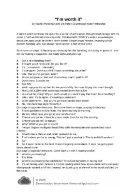 A humorous sketch that can be performed as a dialogue, or broken up into up to 6 parts. Written for youth performers, but could be performed by adults. Aims to contrast the quest for a sense of self-esteem through retails therapy with the sense of self-worth that comes through Christian believing.