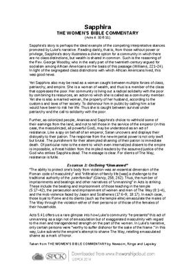 Sapphira’s story is perhaps the ideal example of the competing interpretative stances promoted by Luke’s narrative. Reading darkly, that is, from those without power or privilege, Sapphira’s story illustrates a divine option for a community in which there are no class distinctions, but wealth is shared in common. Such is the reasoning of the Rev. George Woodby, who in the early part of the twentieth century argued for socialism among African Americans on the basis of this passage (Williams, 221–24). In light of the segregated class distinctions with which African Americans lived, this was good news…
