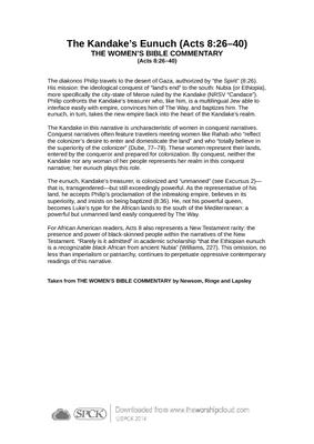 The diakonos Philip travels to the desert of Gaza, authorized by “the Spirit” (8:26). His mission: the ideological conquest of “land’s end” to the south: Nubia (or Ethiopia), more specifically the city-state of Meroe ruled by the Kandake (NRSV “Candace”). Philip confronts the Kandake’s treasurer who, like him, is a multilingual Jew able to interface easily with empire, convinces him of The Way, and baptizes him. The eunuch, in turn, takes the new empire back into the heart of the Kandake’s realm…