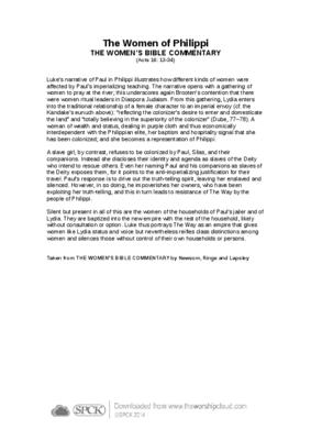 Luke’s narrative of Paul in Philippi illustrates how different kinds of women were affected by Paul’s imperializing teaching. The narrative opens with a gathering of women to pray at the river; this underscores again Brooten’s contention that there were women ritual leaders in Diaspora Judaism…