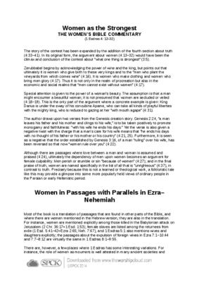 The story of the contest has been expanded by the addition of the fourth section about truth (4:33–41). In its original form, the argument about women (4:13–32) would have been the climax and conclusion of the contest about “what one thing is strongest” (3:5)…