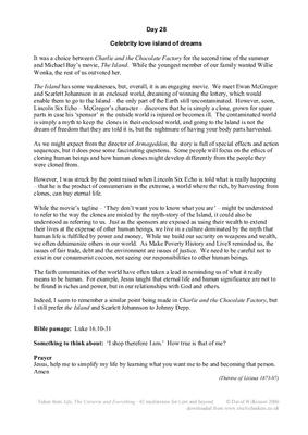 Thoughts taken from TV, Books and life experiences on various topics and given a Christian slant to stimulate thoughts. The topic here for Day 28 is 'Not living in a consumerist cocoon' Looking at the film 'The Island' with reference to Ewan McGregor's character 'Lincoln Six Echo'.