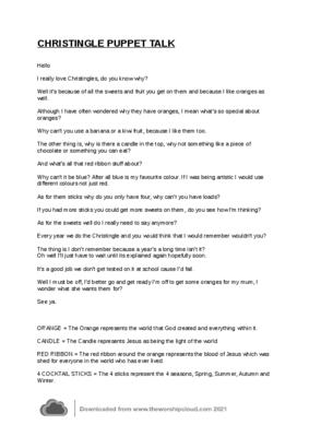 A Puppet talk about the Christingle and asks why the things assocated with it are as they are. The sketch is followed by an explanation of what each element of the Christingle represents and the process of order in which those elements appear. Could be used as part of an assembly or Christingle service