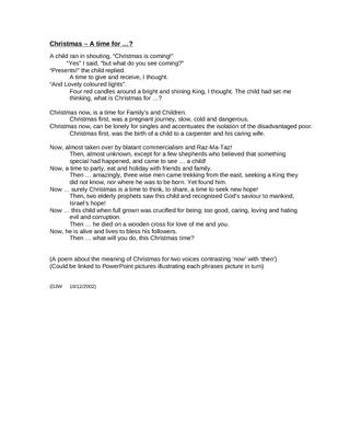 A poem about Christmas contrasting the first Christmas with Christmas now. Finishes with a challenge to the listener.
