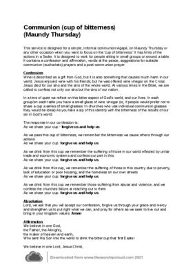 Contains the following service elements - confession, affirmation, peace, suggestions for communion depending on your tradition and a Post-Communion prayer