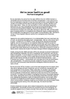 By any standards, the period from the early 1980s to the mid- 1990s has been a remarkable period of transformation for British evangelicalism. In the years prior to this, the expectation of growth in most churches was minimal, media attention was virtually non-existent and the idea of making an impact on society was little more than a pipe dream. Today, not only has decline in church attendance apparently bottomed out, but many evangelical churches are growing dramatically and new churches are being planted regularly. High profile personalities in politics, entertainment and sport are continually ‘coming out’ about their faith, and the media pays increasing attention to evangelical and charismatic issues, as demonstrated by the considerable coverage given to the so-called ‘Toronto Blessing’. BBC Television’s Songs of Praise regularly features worship from evangelical and charismatic churches…