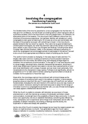 Tim Stratford tells of the time he preached to a new congregation for the first time. To help give him confidence, he had chosen an existing sermon which had gone well on a previous occasion. But in the new church it met only glazed looks. On reflection, he discovered some of the reasons. The new church had a different culture from the churches of his previous experience. He had been familiar with situations in which congregations were good at listening for 20 minutes at a time and comfortable with the idea of the preacher as expert with something to impart. In the new church, people tended to feel ‘put down’ by experts. They were not so good at listening to uninterrupted monologues, but what they did have was a lively sense of community and a desire to give voice to their own thoughts and feelings, including those about Christian faith and life (Stratford, 1998). In this situation interactive preaching, in which the congregation are encouraged actively to participate in the sermon, proved to be a much more appropriate and effective means of building up the church…