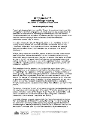 Preaching is characteristic of the life of the Church. An expectation that the worship of the gathered Christian congregation will include a sermon can be traced back at least to the second century in the writings of Justin Martyr. Before that the New Testament testifies to the importance of preaching and teaching as an element in the life of the earliest church and Jesus himself was clearly identified by his contemporaries as a ‘rabbi’ or teacher...