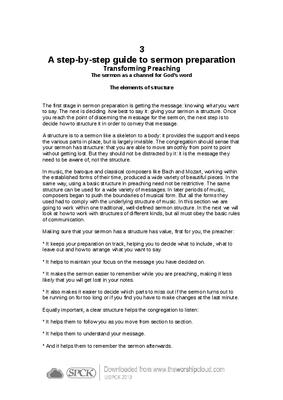The first stage in sermon preparation is getting the message: knowing what you want to say. The next is deciding how best to say it: giving your sermon a structure. Once you reach the point of discerning the message for the sermon, the next step is to decide how to structure it in order to convey that message…