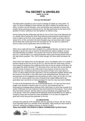 The high priest’s question is not so much a change of subject as it may seem. To claim, as Jesus is alleged to have claimed, the right to replace the temple was, in effect, to claim to be the Messiah, since the Messiah was expected to restore the temple. But by phrasing it as directly as this, the high priest goes to the heart of the question of Jesus’ authority to act and speak in so radical a way…