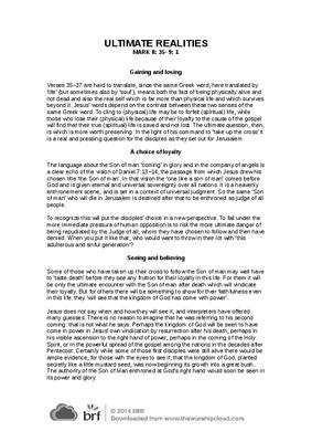 Verses 35–37 are hard to translate, since the same Greek word, here translated by ‘life’ (but sometimes also by ‘soul’), means both the fact of being physically alive and not dead and also the real self which is far more than physical life and which survives beyond it. Jesus’ words depend on the contrast between these two senses of the same Greek word. To cling to (physical) life may be to forfeit (spiritual) life, while those who lose their (physical) life because of their loyalty to the cause of the gospel will find that their true (spiritual) life is saved and not lost. The ultimate question, then, is which is more worth preserving. In the light of his command to ‘take up the cross’ it is a real and pressing question for the disciples as they set out for Jerusalem…
