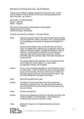 Flavia Good morning, this is Flavia Tertia, with the latest news and views from the people who matter in Jerusalem. First, a worrying setback for Herod Agrippa as the leader of a growing sect escapes from prison. Police are still hunting for Peter, sometimes known as Rocky or Simon. He speaks with a Galilee accent, is physically strong, and subject to outbursts of temper. He leads the followers of Jesus of Nazareth, a radical preacher crucified by Pontius Pilate some years ago. Peter claims to be a devout Jew but the Temple