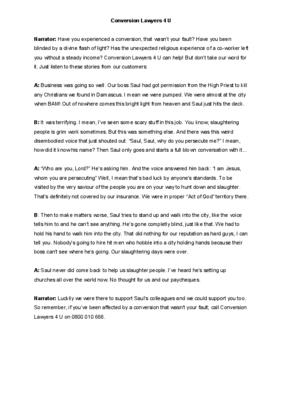Narrator: Have you experienced a conversion, that wasn’t your fault? Have you been blinded by a divine flash of light? Has the unexpected religious experience of a coworker left you without a steady income? Conversion Lawyers 4 U can help! But don’t take our word for