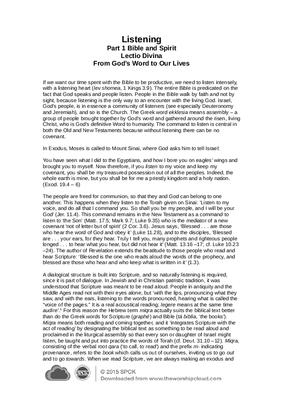 If we want our time spent with the Bible to be productive, we need to listen intensely, with a listening heart (lev shomea, 1 Kings 3.9). The entire Bible is predicated on the fact that God speaks and people listen. People in the Bible walk by faith and not by sight, because listening is the only way to an encounter with the living God. Israel, God’s people, is in essence a community of listeners (see especially Deuteronomy and Jeremiah), and so is the Church. The Greek word ekklesia means assembly – a group of people brought together by God’s word and gathered around the risen, living Christ, who is God’s definitive Word to humanity. The command to listen is central in both the Old and New Testaments because without listening there can be no covenant…