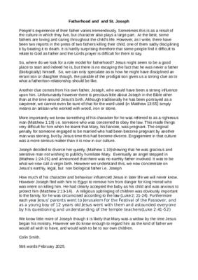 This short sermon/reflection (566words) considers fatherhood for Christians today citing St Joseph as a role model especially at the time of the birth of Jesus. Though little is recorded about him after the birth there is nonetheless sufficient of his character and actions known from which we can learn as fathers even in today’s context. What little we know and its implications for us today is explored in this reflection.