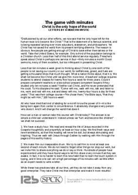 “Disillusioned by all our other efforts, we now see that the only hope left for the human race is to become like Christ.” That is the statement of a famous scientist, and is being repeated among ever more educators, statesmen, and philosophers. Yet Christ has not saved the world from its present terrifying dilemma. The reason is obvious: few people are getting enough of Christ to save either themselves or the world. Take the United States, for example. Only a third of the population belongs to a Christian church. Less than half of this third attend service regularly. Preachers speak about Christ in perhaps one service in four—thirty minutes a month! Good sermons, many of them excellent, but too infrequent in presenting Christ...