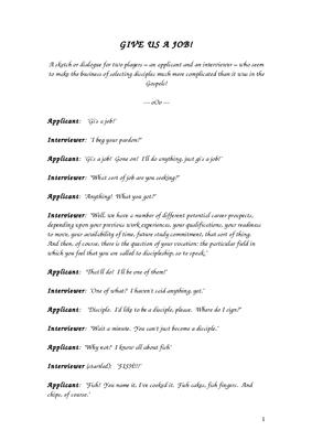 Give Us A Job is a sketch or dialogue for two players – an applicant and an interviewer – who seem to make the business of selecting disciples much more complicated than it was in the Gospels!