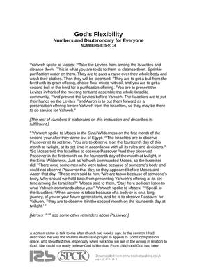 “They do need to keep the rest of the rules,” God adds. “Being flexible because of circumstances doesn’t mean you can ignore them. They’re there for a reason. They aren’t arbitrary.” Thus on other occasions God comes down like a ton of bricks on someone who ignores the rules (Numbers 15 provides a scary example). It’s possible to project legalistic attitudes onto God when really we are the legalistic ones, like the people who gave that misleading impression of God to the woman I spoke of. We’d like life and our relationship with God to be governed by totally clear rules. It isn’t. That’s a mercy, because life is messy. We need the kind of flexibility God is prepared to show.