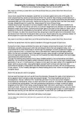 be easy, straightforward or trouble free. Jesus prayed for none of these things. Instead Jesus' prayer focussed on evil as a tangible reality from which his disciples needed to be protected. This was not an off the cuff whim or a concern tangential to the direction he had set for his disciples' mission and ministry. Somehow this prayer gets to the heart of the matter for Jesus. As he prepares his friends for discipleship by themselves, without him being physically alongside, upfront and in the lead, it is clear that Jesus knows they are going to need the same level of protection from the forces of evil intent that he has given them up to now. And he takes this very seriously indeed. Of all the prayers he could have spoken, this is the one he actually offered up to God.