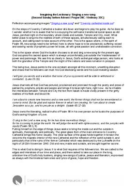 On the steps of Coventry Cathedral a busker sits down and begins to play his guitar. As he does so I wonder whether he is aware that he is occupying the self-same transitional social space as did Jesus, perched right on the boundary where inside and outside, Temple and City, meet. What better place to sing into the realities of both of these spaces, simultaneously calling each to account, and calling each to take account of the other. This is the space where, in the spirit of Psalm 98, new songs need to be birthed; here is where hope is to be proclaimed, suffering voiced and searing words of prophetic power let loose, all with great passion and unshakeable conviction.