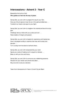 Blessed be the Lord our God Who guides our feet into the way of peace. Saving God, you sent John to prepare the way for your Son. Give your Church grace to hear the cry in the spiritual wilderness . . . Transform our hearts to be open to your Spirit. Saving God, you sent John to straighten the crooked and level the rocky path. Challenge devious minds with your justice and truth . . .
