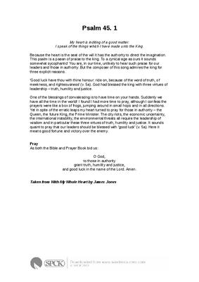 Because the heart is the seat of the will it has the authority to direct the imagination. This psalm is a paean of praise to the king. To a cynical age as ours it sounds somewhat sycophantic! You are, in our time, unlikely to hear such praise for our leaders and those in authority. But the composer of this song admires the king for three explicit reasons...