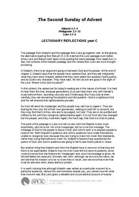 The passage from Malachi and the passage from Luke go together well. At first glance, the alternative reading from Baruch (5.1–9) matches the Luke passage even better, since Luke and Baruch both seem to be quoting the same passage from Isaiah but, in fact, the contexts of the Malachi passage and the verses from Luke are more thought-provoking.
