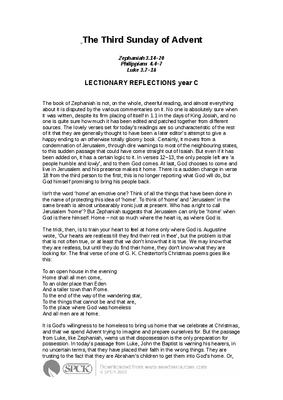 The book of Zephaniah is not, on the whole, cheerful reading, and almost everything about it is disputed by the various commentaries on it. No one is absolutely sure when it was written, despite its firm placing of itself in 1.1 in the days of King Josiah, and no one is quite sure how much it has been edited and patched together from different sources. The lovely verses set for today’s readings are so uncharacteristic of the rest of it that they are generally thought to have been a later editor’s attempt to give a happy ending to an otherwise totally gloomy book. Certainly, it moves from a condemnation of Jerusalem, through dire warnings to most of the neighbouring states, to this sudden passage that could have come straight out of Isaiah. But even if it has been added on, it has a certain logic to it. In verses 12–13, the only people left are ‘a people humble and lowly’, and to them God comes. At last, God chooses to come and live in Jerusalem and his presence makes it home. There is a sudden change in verse 18 from the third person to the first; this is no longer reporting what God will do, but God himself promising to bring his people back...