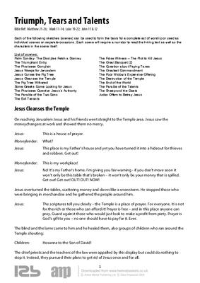 Each of the following sketches (scenes) can be used to form the basis for a complete act of worship or used as individual scenes on separate occasions. Each scene will require a narrator to read the linking text as well as the characters in the scene itself.
