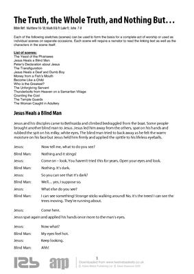 Each of the following sketches (scenes) can be used to form the basis for a complete act of worship or used as individual scenes on separate occasions. Each scene will require a narrator to read the linking text as well as the characters in the scene itself.