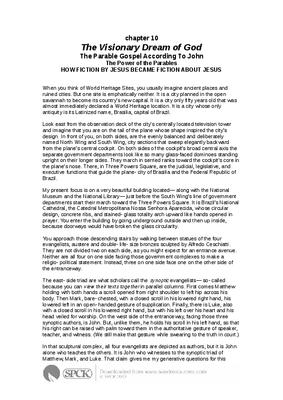 In that sculptural complex, all four evangelists are depicted as authors, but it is John alone who teaches the others. It is John who witnesses to the synoptic triad of Matthew, Mark, and Luke. That claim gives me my generative questions for this chapter. If each of the synoptic gospels has created a megaparable— whether it is challenge and/or attack— about Jesus of Nazareth, how does John’s parable “instruct” those others? Does it do so by challenge or attack? Even more important, does it “instruct” them correctly or incorrectly? Throughout this chapter, therefore, those provocatively positioned evangelists from Brasilia’s National Roman Catholic Cathedral will remain as a permanent visual matrix.
