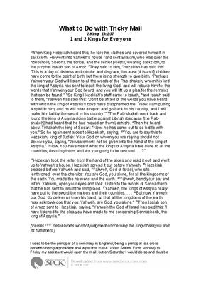 I used to be the principal of a seminary in England; being a principal is a cross between being a president and a provost in the United States. From Monday to Friday my assistant would open the mail, but on Saturday I would do so and thus be the first person to see the tricky letters. Among them there might be one telling me that the bishops are reducing the number of people we can admit next year. Or the university with which we are affiliated might be changing the regulations that govern degrees in a way that will be complicated to implement in the seminary. Or a local rector might be complaining about something a student has done in his parish. (Or even a weird seminary in California might be wanting to offer me a job.) I used then to be glad that I could do what Hezekiah does in this story. I don’t think I ever literally stood in the middle of my office and held up to God one of those tricky letters and said, “Look at this!” But in my imagination that’s what I was doing...