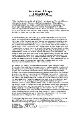 For Hannah, too, the hour of prayer was initially sour, though eventually sweet. Presumably she prayed when she was at home in the village, as other Israelites did, but the occasion when the family went to Shiloh would be a natural time for special prayers. We have already seen how the annual festival was designed to be an occasion of great joy and celebration as people rejoiced in the harvest that God had given them and also in the commemoration of God’s giving them their freedom and their place in the land, but for Hannah it had become consistently an occasion when her infertility was driven home to her. This fact would give extra drive to her pressing her agenda with God. Further, the sanctuary that is the focus of the festival is, after all, God’s this-worldly dwelling, an earthly equivalent of God’s dwelling in the heavens. It is God’s palace; Hebrew doesn’t have a word for “temple” but uses either the word for “house” or the word for “palace,” because the temple is the equivalent to a human being’s home and thus in particular the equivalent to a king’s palace. It is a portal; a place of contact, of interchange, and of movement between earth and heaven; a place from which prayers and praises can naturally reach the heavens and where messages from the heavens can reach the earth. It is thus the place where prayer is especially possible; and for Hannah the pain associated with this annual celebration makes it the place where prayer is necessary, too...