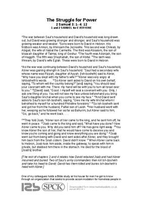 One of my colleagues holds a Bible study at his house for men he got to know through an organization that seeks to provide accommodation for homeless people in our city; they are typically people who have prison records and/or who have battled alcoholism or other addictions. Membership of the Bible study grows through word of mouth. The men had been reading John’s Gospel and then for some reason started to read 2 Samuel, and some of them came alive when they read the stories about Abner’s gang fighting Joab’s gang and Abner killing Asahel and Joab killing Abner. As they read these stories, their eyes widened. If God could be involved with the kind of people who appear in 2 Samuel, maybe God could be involved with these men themselves, who have acted in comparable ways...