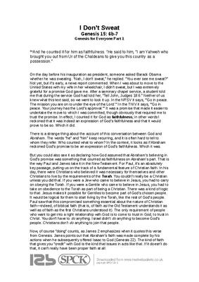 On the day before his inauguration as president, someone asked Barack Obama whether he was sweating. “Nah, I don’t sweat,” he replied. “You ever see me sweat?” Not yet, but it’s early, a news report commented. When I was about to move to the United States with my wife in her wheelchair, I didn’t sweat, but I was extremely grateful for a promise God gave me. After a seminary chapel service, a student told me that during the service God had told her, “Tell John, Judges 18:6.” Neither of us knew what this text said, so we went to look it up. In the NRSV it says, “‘Go in peace. The mission you are on is under the eye of the Lord.’” In the TNIV it says, “‘Go in peace. Your journey has the Lord’s approval.’” It was a promise that made it easier to undertake the move to which I was committed, though obviously that required me to trust the promise. In effect, I counted it for God as faithfulness; in other words I reckoned that it was indeed an expression of God’s faithfulness and that it would prove to be so. Which it did...