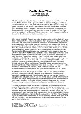 I first visited the Middle East six years after Israel occupied the West Bank. We were based mostly in Tel Aviv, but we had not been there long before we drove up into the West Bank and went to Nablus, one of its three most important towns. The name is an abbreviation of Neapolis, the “New City” founded by the Romans after the fall of Jerusalem in AD 70. The “old city” is Shechem, on the eastern edge of the modern town, the first place Abraham stopped when he arrived in the country. It has always been an important center, a place with a good water supply, surrounded by good farming land, and located at a major road crossing where the east-west route (up which we drove) from the Mediterranean to the Jordan Valley crosses the main north-south route along the mountain spine of the country (down which Abraham would have traveled). It is also next to Jacob’s Well, the scene of the story in John 4, as well as the tomb of Joseph. I remember the extraordinary excitement of being in the very footsteps of Abraham, looking at the same surrounding hills and the same stones in the same Canaanite place of worship whose remains are still visible (though now more difficult to visit as the Palestinian people have campaigned for their independence). The word for “site” often refers to a place of worship. One of the features of the archaeological site is a huge, broken stone pillar that the archaeologists reerected. I imagined how Abraham had looked at this very stone...