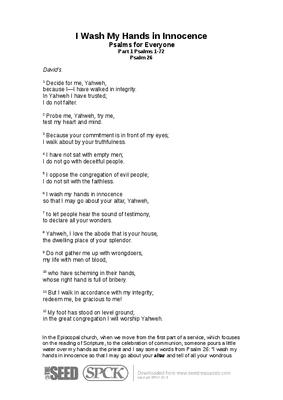 In the Episcopal church, when we move from the first part of a service, which focuses on the reading of Scripture, to the celebration of communion, someone pours a little water over my hands as the priest and I say some words from Psalm 26: “I wash my hands in innocence so that I may go about your altar and tell of all your wondrous deeds.” The practice, going back to the time of Cyril, Bishop of Jerusalem in the fourth century, means a lot to me, because telling of God’s wondrous deeds (in this context, telling of Jesus’ Passover celebration with his disciples, his dying for us, and his rising from death) is a responsible activity, designed to glorify God and be a blessing to his people. In the same century, John Chrysostom, Archbishop of Constantinople, mentions a practice whereby everyone washed their hands before going into church for worship. We all need to be prepared for listening to this story. Our church has a bowl of holy water just inside the door for people to dip a finger into and cross themselves, which can fulfill a similar function...