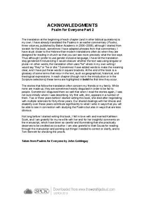 The translation at the beginning of each chapter (and in other biblical quotations) is my own. I have already translated the Psalms in an earlier commentary (Psalms, three volumes, published by Baker Academic in 2006–2008); although I started from scratch for this book, sometimes I have adapted phrases from that commentary. I have stuck closer to the Hebrew than modern translations often do when they are designed for reading in church so that you can see more precisely what the text says. Thus although I prefer to use gender-inclusive language, I have let the translation stay gendered if inclusivizing it would obscure whether the text was using singular or plural—in other words, the translation often uses “he” where in my own writing I would say “they” or “he or she.” Sometimes I have added words to make the meaning clear, and I have put these words in square brackets. At the end of the book is a glossary of some terms that recur in the text, such as geographical, historical, and theological expressions. In each chapter (though not in the introduction or in the Scripture selections) these terms are highlighted in bold the first time they occur...