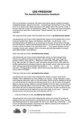The cry for freedom is universal. We hear it from ethnic groups, political minorities, subjugated peoples, oppressed women – and teenagers everywhere! It has a ready echo in our hearts and a deep resonance in the gospel where the promise is that, ‘if the Son shall set us free, we shall be free indeed’. This makes the theme of freedom a strong one to work with in intercession. Topical situations are, as ever, a vital ingredient…