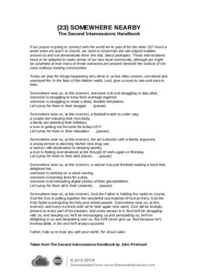 If our prayer is going to connect with the world we’re part of for the other 167 hours a week when we aren’t in church, we need to remember the raw-edged realities around us and not domesticate them into tidy, bland packages. These intercessions need to be adapted to make sense of our own local community, although we might be surprised at how many of these scenarios are present beneath the surface of the most ordinary-looking communities…