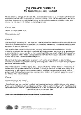 There’s something lastingly attractive about the delicate bubbles produced by blowing through the circular instrument in the little tubes of liquid you can easily buy from toy shops. The bubbles come out with a rush; some burst immediately; others drift slowly around, eventually finding their way into oblivion. Here is an obvious way in to prayer with children, or at an all-age service…